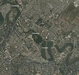 Lake Fundeni is a man-made lake on the Colentina River in Bucharest, Sector 2. It has a surface of 35 ha (86 acres), length of 2.1 km (1.3 mi), width of 200–800 m, a depth between 1 and 5 meters, and a volume of 800,000 m3 (1,000,000 cu yd).[1]
