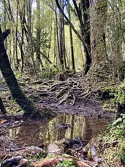 Like nearby Lake Matheson, Lake Gault is dystrophic: its water is stained brown in colour with tannins leached from surrounding forest, low in nutrients, acidic, and has a sparse and specialised phytoplankton.[4][5] And as in Lake Matheson the dark water creates spectacular reflected views of the Southern Alps, especially Aoraki / Mount Cook and Mount Tasman.[6][7]