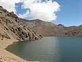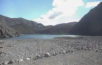 Lake Ifni (Arabic:Dayet Ifni) is a green lake located in the soil of Toubkal National Park, in the Moroccan Toubkal (commune), deep in the High Atlas mountain range, with a continental climate, and directly overlooked by the highest peak in North Africa, which is the summit of Mount Toubkal. The lake is distinguished by its steep slopes, its location at the end of the valley, its great depth, and its height above sea level, which is about 2,500 meters. It is therefore one of the highest lakes in the world. Its area is about 26 hectares, its length is estimated at 870 meters, and its width is about 490 meters. with a discharge rate of 300 meters per second, and a depth exceeding 30 meters.[1][2]