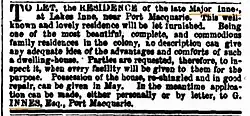 News has been brought into Port Macquarie that late on Saturday the old residence on the Lake Innes Estate, built by Major Innes (convict labour) was burnt to the ground. The police are endeavouring to find out the cause of the fire, but have not yet succeeded. The building was erected soon after Port Macquarie was formed a convict settlement. It has not been inhabited for over twenty-five years, and was little better than a ruin at the time of the fire. The property was owned by Mr. Zions of Sydney.[30]