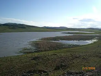 The shores of the lake are covered with reeds. Wheat fields surround the lake. The lake is an important breeding place for waders. It is a habitat for black-necked grebe, ferruginous duck and coot. It host also diverse bird species during the migration periods.[1]
