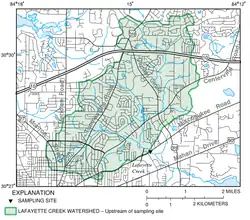Lake Lafayette is fed by Lafayette Creek, draining a significant portion of northeastern Tallahassee; it has a drainage basin of approximately 10 sq mi (26 km2).[2] The creek flows into a small reservoir upstream from Lake Lafayette, impounded by a weir at the Weems Road bridge, then continues into Upper Lake Lafayette. Lower Lake Lafayette formerly flowed into the St. Marks River underground, and in sheet flow after heavy rains; it currently is connected to the river by a canal.[1]