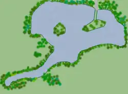 The lake is considered "well stocked" in that it supports a large community of largemouth Bass and various catfish. The lake is generally green in color with photosynthetic plankton and low in weeds due to invasive grass carp. The bottom of the lake is between 6–10 feet (1.8–3.1m) in depth and strewn with small branches and trees due to beaver activity. No swimming is allowed due to alligators and rare plankton blooms that have turned the water bright orange for months.