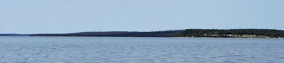 Lake Nemiscau with the settlement of Nemiscau on its shore.