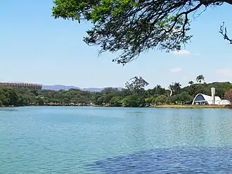 Lake Pampulha (Portuguese: Lagoa da Pampulha, Portuguese pronunciation: [pɐ̃ˈpuʎɐ]) is an artificial lake located in Pampulha, Belo Horizonte, in the Brazilian state of Minas Gerais.[1][2] Pampulha is also the name of an administrative region (região administrativa) of Belo Horizonte, and the name of one of 29 neighborhoods (bairros) within the administrative region of the same name. The lake was built in the early 1940s during the mayoralty of Juscelino Kubitschek, later president of Brazil from 1956 to 1961. Pampulha was created as a source of drinking water for the city of Belo Horizonte, but quickly became polluted.[3]