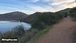 The lake has a 2.75-mile loop trail that circles the reservoir and links to other trails such as the Blue Sky Ecological Reserve trail to Lake Ramona, and the more difficult route to the top of Mount Woodson,[9] and the Potato Chip rock.[14]