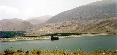 Lake Qaraoun (Arabic: بحيرة القرعون / ALA-LC: Buḥayrat al-Qara‘ūn) is an artificial lake or reservoir located in the southern region of the Beqaa Valley, Lebanon. It was created near Qaraoun village in 1959 by building a 61 m-high (200 ft) concrete-faced rockfill dam (the largest dam in Lebanon) in the middle reaches of the Litani River (longest river in Lebanon). The reservoir has been used for hydropower generation (190 MW or 250,000 hp), domestic water supply, and for irrigation of 27,500 ha (68,000 acres).[1][2]