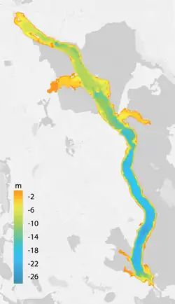The long and narrow lake runs in a north-south direction, and its course is characterized by numerous bends. The total length of the lake, measured along the centerline, is 12.01 kilometres (7.46 mi), with an average width of only 497 metres (1,631 ft). At its widest point, the lake measures 1,650 metres (5,410 ft). While historical sources often list the lake's area as 654.1 ha (2.525 sq mi)[7] —a figure that continues to be incorrectly cited— modern government topographic maps show it as 613.4 ha (2.368 sq mi).[8] The coastline is 35.8 kilometres (22.2 mi) long.