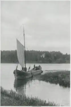 Another popular method of transporting goods across the lake was the Oberland barge also known as the Oberland sailing barge (German: Oberländer Segelkahn) or Oberland cargo barge (German: Oberländer Lastkahn). These barges were smaller than the vessels typically operating in Prussia at the time, due to the dimensions of the canal itself. The barges were wooden sailing vessels with one or two masts.[20]