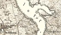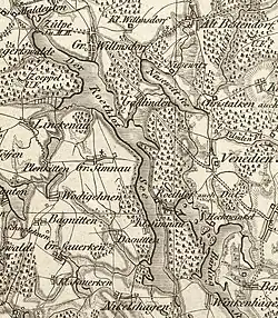 One of the earliest preserved mentions of the original German name of the lake—Röthloff (or Roethloff) See —appears in 16th-century historical documents, although the name must have been in use much earlier. The name Röthloff is found in a document from the Teutonic Order dated 1522, in which Grand Master Albert granted fishing rights on Lake Röthloff to brothers Paul and Wolf Fasolt from Iława.[2] This name also appears on a 16th-century map of the Oberland region of Prussia by Caspar Henneberg from 1576.[3]
