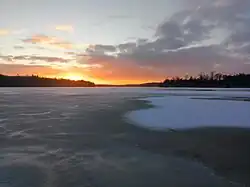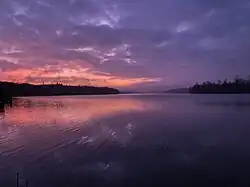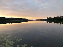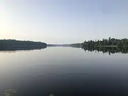 Lake Ruda Woda ([ˈruda vɔda]; German: Röthloff See) is a long freshwater ribbon lake in Powiśle region in northern Poland. The lake lies entirely within Gmina Małdyty in Warmian-Masurian Voivodeship and is an integral part of the Elbląg Canal. Stretching 12 kilometres (7.5 mi) in length, the lake features four distinct bays and several islands. The lakebed is diverse, with numerous depressions and shallows. Shores are mostly high and steep, surrounded by temperate deciduous forest, with only the southern and northern parts bordered by fields and meadows.
