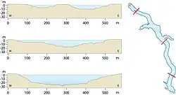 The construction of the canal was a massive hydrotechnical undertaking, fundamentally impacting lake's morphometry, which was the longest natural section of the emerging waterway. The difference in elevation between the water level of Lake Drużno, where the route begins, and Lake Jeziorak, where it ends, was 99.4 metres (326 ft). The water levels of the lakes along the canal's route were equalized to meet of those of Lake Jeziorak (99.4 metres (326 ft)). Before the lowering, Lake Ruda Woda’s surface was at an elevation of 101.3 metres (332 ft). As a result of the canal's construction, its water level dropped by over 1.7 metres (5 ft 7 in). Consequently, its original area became almost 8.5% smaller.[15] The excess water from the lowered lake was drained into Lake Drwęckie, and then through the Drwęca River to the Vistula River and the Baltic Sea.[16] Bernhard Ohlert's account of his multi-day expedition along the Oberland Canal in 1862 describes the consequences of the lowered water level in Lake Ruda Woda. Ohlert noted:[16]
