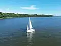 Two distinct, noticeably shallower bays can be found to the east and west of the main body of water. The western bay near the village of Sople contains three small islands. On the opposite shore of the western bay, where the former site once served to store and prepare wood for rafting, a scout camp has been established. The camp hosts annual sailing and scouting events. The eastern bay, known as Zatoka Drela (Drela Bay) or Żydowski Kąt (Jewish Corner), is where the lake's main tributary, the Drela River (German: Drehle), flows in. The name Żydowski Kąt (Jewish Corner) originates from wartime stories among the local population, which claim that the Jewish owner of a nearby inn and his family were drowned in the lake.[9] Stretching to the southeast, Drela Bay, together with the lake's main route, forms a peninsula known as Stańkowo.[10] In the southern part of the lake, two small bays extend northwest, where the village of Liksajny is located. The lake features seven uninhabited islands, the largest of which is situated in the northern part, opposite the village of Wilamowo.