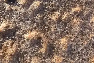 The lake environment is host to Mallee reptiles, kangaroos, emus, and the white-fronted chat, an insectivorous bird.[5] Thousands of seagulls breed on small islands on the lake.[5][6] Surrounding vegetation is made up of saltbush and samphire, which supports a range of wildlife.[5] To the east, the lunette contains significant Aboriginal relics.[5]