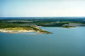 Originally built in 1930 by Callahan Construction Company,[1] the Lake Waco Dam was used to control flooding of the Bosque river and to provide the city of Waco with a consistent water source. Due to increasing flood threats and population growth, the Flood Control Act of 1954 allowed for construction of a modern earthen dam to replace the original structure. The new dam, finished in 1965 by the U.S. Army Corps of Engineers,[2] was 24,618 feet (7,504 m) in length with a height of 140 feet (43 m), increasing the surface area of the lake to 8,190 acres (3,310 ha).[3] While the original dam cost only $2.5 million to construct,[4] the new dam would reach a cost of $53.4 million.[5] In 2003, the top of the conservation pool was raised by 7 feet (2.1 m) to bring the water level to 462 feet (141 m) above sea level.[6]
