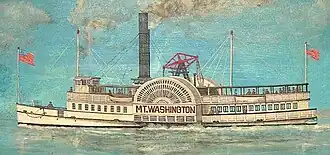 The paddlesteamer MS Mount Washington, named after the highest of New Hampshire's White Mountains, was launched in spring 1872 to carry mail, goods, and passengers on Lake Winnipesaukee, under the flag of the Boston and Maine Railroad. With a hull length of 178 feet (54 m) and a beam of 49 feet (15 m) she appeared as a typical representative of the North American sidewheelers around the second half of the century and was the largest steamer on the lake at that time. The huge paddle wheels were driven by a single-cylinder steam engine of 450 hp (340 kW) at approximately 26 rpm. The power was transferred from the vertical single cylinder to the wheel shaft by the walking beam, high above the upper deck, oscillating in the frequency of the paddle wheels. Known as "The Mount", her kitchen and restaurant service became famous.