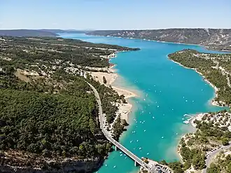 ![]() The lake seen from the northeast, with the Pont du Galetas at the bottom, on the border between Var and Alpes-de-Haute-Provence | |