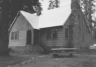 With eight historic buildings, the Lake of the Woods Ranger Station is a classic Forest Service ranger station. The buildings were designed by the Forest Service's Pacific Northwest Regional Architecture Group. All of the structures were built by the Civilian Conservation Corps between 1937 and 1939. Their work included a ranger station administrative office, two ranger residences, a crew house, garage, gas and oil shed, storage shed, and a barn. The buildings except the barn were constructed in the Cascadian rustic architectural style using weatherboard, wood shingles, native stone, and concrete as the basic building materials. The barn is a peeled-log structure. Many of the gables have the open pine tree logo cutouts that were common to Forest Service structures built during the 1930s.[6][8][9]