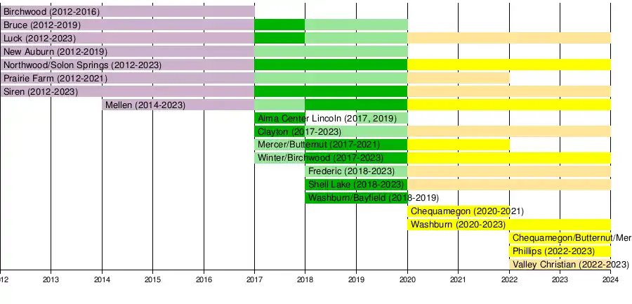 | Grantsburg | 9 | 2003, 2004, 2015, 2016, 2017, 2018, 2022, 2023, 2024 |
