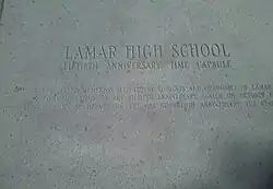 On October 17, 1987, Lamar High School and its students celebrated its 50th anniversary by creating a time capsule to teach the students in the future how high school life was like in the 1980s. The time capsule was buried in front of Lamar's main entrance where it lies today. The plaque that marks where the time capsule lies is made from marble donated by the community of River Oaks and fundraising events held at Lamar at the time.