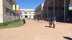 Courtyard of Lamar High School. Lamar students wearing school uniforms are visible in this picture.