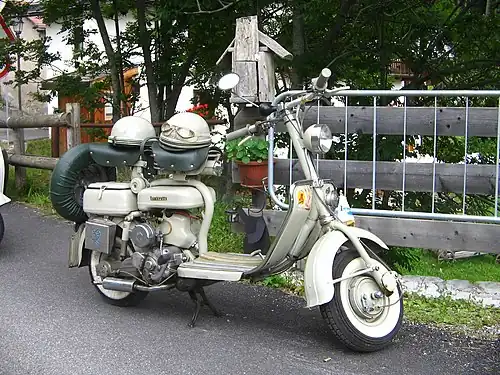 The 123cc engine and transmission was upgraded and simplified in an attempt to improve reliability as well as improving the ride of the scooter.[2] The top end kept the same construction with the cylinder made of cast iron and head aluminium but the cooling system was enlarged to make the bike more reliable in heat and under strain.[3] The new Carburetor was a Dell'Orto MA18. The transmission provided by a 3-speed gearbox and was shaft driven. The exhaust was revised to reduce noise and vibration.[2] In 1954 due to demand from the public, for a larger engine, the Model D150 was announced with a 148cc engine. The overall top speed was improved slightly but the main area of improvement was in torque and gear ratios to make the ride smoother and to help the scooter make it up mountain passes.[6]