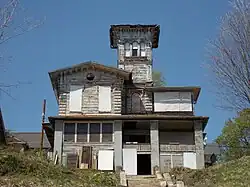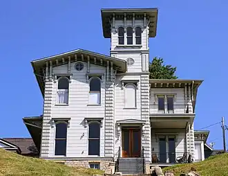 The house is a two-story frame structure in the Italian Villa style. It features a three-story tower, bracketed eaves, tall windows, and quoins on the corners. It is unknown who painted the three-story fresco in the central staircase.[8] It was painted using the trompe l'oeil style that makes the walls look like white marble with inset panels of green marble that are trimmed with wood molding. The porches added in 1925 have been removed and two small porches and a balcony have been restored. The roof is composed of a synthetic slate. A two-story addition was built onto the back house, and it has been rebuilt in the 21st-century restoration. A two-car garage that is architecturally compatible with the house was built into the hillside next to the house.