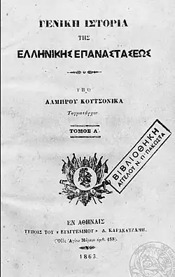 - ^ General History of the Greek Revolution, (Γενική Ιστορία της Ελληνικής Επαναστάσεως) vol. 1. Presentation of a modern edition of the book. Editions “Vergina”, 2002. In greek.