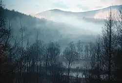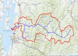The Lamoille River is a river which runs through northern Vermont and drains into Lake Champlain. It is about 85 miles (137 km) in length, and has a drainage area of around 706 square miles (1,830 km2). The river generally flows southwest, and then northwest, from the water divide of the Green Mountains. It is the namesake of Lamoille County, Vermont, through which it flows. The river was the basis of the name of the now-defunct Lamoille Valley Railroad Company, successor to the St. Johnsbury and Lamoille County Railroad.