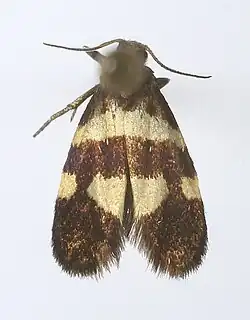 The wingspan is about 12 mm. The head is fuscous. Forewings dark purple-fuscous; a sometimes interrupted fascia about 1/4, a subquadrate costal spot beyond middle, and a larger triangular dorsal spot before tornus yellow; tips of apical cilia whitish. Hindwings dark fuscous.[1] Adults are on wing from May to July and fly in afternoon sunshine.