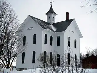 The former Lampson School occupies a prominent site in the village of New Haven Mills, bounded on the south by Summer Road, the east by River Road, and the northeast by East Street. It is set on a rise, facing east toward River Road and the New Haven River. It is a two-story wood-frame structure, with a T-shaped footprint consisting of a north–south main block and a center projection to the east, all resting on a stone foundation and sheathed in clapboards. The roof sections are gabled, with paired brackets in the eaves, and an open cupola with round-arch openings at the center of the roof. Windows are generally tall round-topped sash, and the original main building entrances are located on the sides of the eastern projection. The interior retains most of its original materials and finishes, despite a nearly 50-year period in which some were covered by other materials.[2]