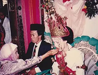 ![]() A Lampung bride and bridegroom in 1987. Both of the couples are of the Sungkai Bungamayang clan. The traditional headgear of the bride, which is called Siger, is commonly used in Lampung weddings. | |