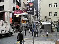 Lan Kwai Fong (Chinese: 蘭桂坊), often abbreviated as LKF, is a small square of streets in Central, Hong Kong. The area was dedicated to hawkers before the Second World War, but underwent a renaissance in the mid-1980s. It is now a popular expatriate haunt in Hong Kong for drinking, clubbing, and dining. The street Lan Kwai Fong is L-shaped with two ends joining with D'Aguilar Street.[1]