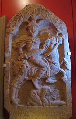The museum was founded in 1923, and its collections illustrate the archaeology and history of the city and surrounding areas.[3] Among its highlights is the Lancaster Roman Tombstone, a memorial dating from c. 100 AD which was found locally in 2005. It depicts a Roman soldier on horseback with a decapitated opponent at his feet, and is described as "an iconic piece of Lancaster's dramatic past [giving] a crucial insight into the history of the county."[4][5][6] The museum was also successful in acquiring the Viking-era Silverdale Hoard, discovered in the City of Lancaster district in 2011, for its collection.[7][8][9] The collections also include the King's Own Royal Regiment Museum.[10]