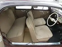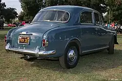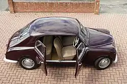 The Appia Berlina (saloon/sedan) was introduced in April 1953 at the Turin Motor Show.[3] The chassis code is C10 for the right hand drive saloon—the standard version, as was customary at Lancia—and C10S (from Sinistra, Italian for "left") for the left hand drive variant, available on request. Under the Appia's bonnet there is a 38 PS 1.1-litre engine, which according to the manufacturer could push the car to 120 km/h (75 mph).[3] The body style is similar to the Lancia Aurelia. To save weight the doors and rear fenders of the first few thousand examples were aluminium.[3] The bumpers were also aluminium, making them easily dented. Rubber stripping was added later, to protect them from minor impacts.[3] In a design inaugurated by the 1933 Lancia Augusta, rear doors were aft-hinged suicide doors, eliminating the B-pillar. A spare tyre, the fuel filler and the battery were located in the trunk/boot. The interior featured bucket front seats, a column-mounted shifter, ivory plastic steering wheel and switches, and panno Lancia wool cloth upholstery in grey or beige. Running on 155HR15 Pirelli Cinturato tyres. In total 20,025 first series saloons were made, from 1953 to 1956.[3] Of these, the majority—10,257—were right hand drive, and the remaining 9,768 left hand drive.[4]