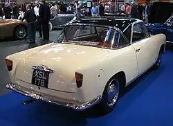 At the November 1958 Turin Motor Show, the new Lancia Appia GTE (standing for Gran Turismo Esportazione) was introduced, with deliveries starting in January 1959.[22] The GTE marked an important change in the relationship between Zagato and Lancia: it was the first Zagato car to be included in Lancia's price lists and sold by Lancia dealers. For Lancia Zagato went from a buyer of chassis to an official supplier of specially bodied finished cars. First shown to the public at the 1958 Turin Motor Show, the first GTEs were delivered in early 1959. GTE bodywork was more low slung and streamlined than its predecessors'. The car had a continuous waistline, without the previous humps over the rear wheels; the nose was longer, and the under elongated Plexiglas covers the headlights were set deeply into the wings. At the rear the tail lights were partially sunken in and crowned by protrusions in the bodywork.