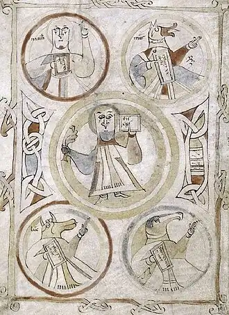 The Landévennec Group is a group of 10th and 11th century illuminated manuscripts of the Four Evangelists from Basse-Bretagne, probably all from the scriptorium of Landévennec Abbey. Influenced by insular art, they are marked by their representation of the evangelists as humans with animal heads.