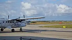 In 1984, Isles of Scilly Skybus started operations at the airport, initially freight and charter, then scheduled services from April 1987,[9] flying Islanders and de Havilland Canada DHC-6 Twin Otters.[6] Skybus became the sole remaining air link for the Isles of Scilly from October 2012, when the helicopter service from Penzance ended.[10]