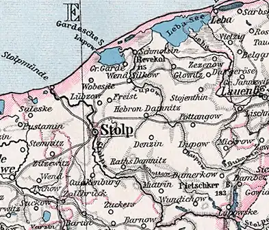 The Landkreis Stolp (Stolp [rural] district; 1648 to 1898: Kreis Stolp) was a Brandenburg-Prussian district in Farther Pomerania formed in 1648 from the Landvogtei Stolp (Stolp land advocacy). It weathered the alterations of the Farther Pomeranian district borders in 1724 unchanged. In 1815, with the introduction of government regions, Stolp District became part of the new Köslin Region in the enlarged Province of Pomerania in Prussia, part of the German Federation (1815-1866), North German Confederation (1867-1871) and the united Germany of 1871.