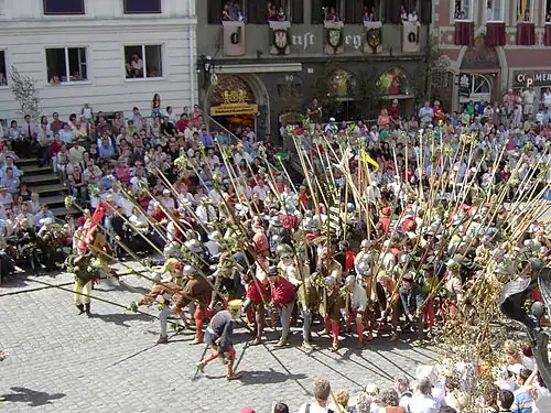 The number of members of "Die Förderer" society rose from 855 to 7146 during the years 1973 to 2013.[1] The renewed interest in medieval history made the event a major success in terms of tourism. Today the 60,000 or so inhabitants of Landshut welcome 600,000 to 700,000 visitors during the three weeks of the festivities, with some 120,000 visitors watching the bridal procession. The sponsors are able to collect money in the range of 3.5 million euros to allow for the event to take place.