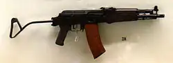 | AKM | Assault rifle | Manufactured by the state arsenal as the MPi-KM (fixed stock, later variants were distinctive stippled plastic) and MPi-KMS-72 (AKMS) with a single strut "coathanger" side-folding stock | ![]()