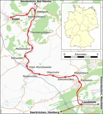 West of Landstuhl station, the line to Saarbrücken separates to the left and the line heads to the north. First, it crosses the Bruch country. From Ramstein the line follows the Mohrbach and runs to the west to Glan-Munchweiler. The line, which is now running through the North Palatine Uplands, then turns north to follow the course of the Glan to Altenglan. It turns then west to follow the course of the Kuselbach to Kusel.[6] From Landstuhl to Niedermohr, the line runs through the district of Kaiserslautern and from Glan-Munchweiler it runs through the district of Kusel.