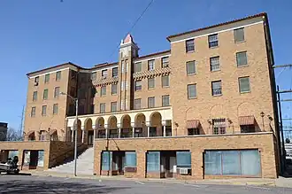 The Lane Hotel is a historic former hotel building in Rogers, Arkansas, United States. It is a five-story yellow brick Spanish Revival building, designed by architect John Parks Almand and completed in 1929. It is the largest Spanish Revival building in Arkansas, with a prominent colonnade of arches at the second level, above a first floor series of commercial storefronts, and a central tower. The hotel was not successful, having been completed just at the outset of the Great Depression, and went through a succession of owners before closing in 1965.[2] Beginning in 1999 it was a retirement community known as Peachtree on the Lane