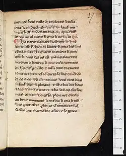 Lanfranc had put rational surgical intervention on a par with medicine prescribed by physicians.[11] In 1314 Henri de Mondeville published his Latin thesis Chirurgia in which he relied on the arguments of Lanfranc to position surgery as medicine.[12] Lanfranc's treatise on surgery Chirurgia Magna, also known as the Science of Chirgurie or Cirgurie to distinguish it from the Inventarium, and other manuscripts on what was regarded to be rational surgery were in the 14th century translated into English and were eagerly read in England as surgery textbooks. In the English translations of Chirurgia Magna the practical advice passed on by Lanfranc was given more room than the theoretical knowledge Lanfranc had also cared to impart.[13] The Chirurgia Magna was republished as book in over seventy editions and translated into multiple languages from 1490 onward.[14] Lanfranc is remembered in the English surgery profession for recommending in the Chirurgia Magna bloodletting to treat localized pain, such as migrane.[15]