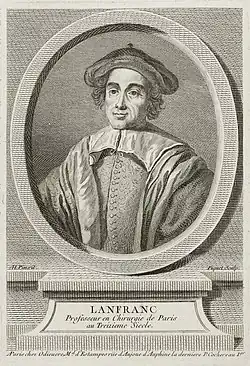 Born in mid 13th century Milan, Lanfranc was trained in surgery by Guglielmo da Saliceto in Bologna. To escape the Guelphs and Ghibellines feud, Lanfranc left[2] his practice in Milan and moved first to Lyon and then to Paris where he settled around 1295.[3] Lanfranc found employment as surgery lecturer at the Collège de St. Côme, which Louis IX of France had built to elevate the status of surgeons in the medical profession.[4] Surgeons trained at the college were no longer barber surgeons but were not admitted to the medical faculty.[5]