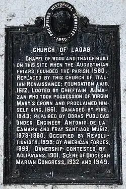 The first church of Laoag was made of wood and thatch when the Augustinians established the parish in 1580. The foundations of the current church were laid in 1612. It was damaged by fire in 1843 and was restored from 1873 to 1880 by the Obras Publicas under Engineer Antonio de la Camara and Father Santiago Muniz.