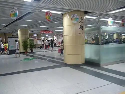 Laojie station (Chinese: 老街站; pinyin: Lǎojiē zhàn; Jyutping: Lou5 Gaai1 Zaam6; lit. 'Old Street station') is a station on the Shenzhen Metro. It provides cross-platform interchange between Line 1 and Line 3. The station is the busiest on the network with 61,600 passenger entries and exits a day.[2] The Line 1 platforms opened on 28 December 2004 and the Line 3 platforms opened on 28 June 2011. It is located underneath the junction of Shennan Fudao (simplified Chinese: 深南辅道; traditional Chinese: 深南輔道), Jiefang Road (解放路) and Jianshe Road (建设路; 建設路) in the Luohu District of Shenzhen, China. The station is the closest to the Dongmen Business Area (东门商业区; 東門商業區), one of the oldest areas in Shenzhen established in the Ming dynasty.[3]