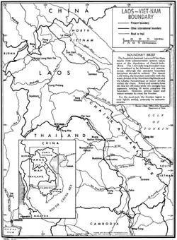 Historically the Annamite Range formed a natural boundary between Vietnamese kingdoms in the east and Lao, Thai and Khmer kingdoms in the west.[2] From the 1860s France began establishing a presence in the region such as French Cochinchina and the Kingdom of Cambodia, modern-day Cambodia and Vietnam, and the colony of French Indochina was created in 1887.[2][3] Laos was at this point part of the Kingdom of Siam (the old name for Thailand), however it was annexed to French Indochina in 1893 following the Franco-Siamese crisis.[2][4][3] The precise date of the delimitation of the frontier is unclear; the International Boundary Study states that "The juridical basis of the Laos–Viet-Nam boundary probably stems from ancient treaties and custom as modified or made more specific by decrees of the Indochinese administration."[2] Part of the border was demarcated in 1916 following a dispute, and French maps were drawn up during the colonial period that were used as the basis for the later international border.[2][3]