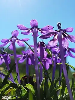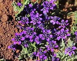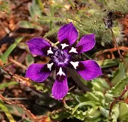 The flowers are actinomorphic, being star-shaped, rather than the two-lipped flowers that are common for the cabong genus Lapeirousia.[8] The flowers of L. oreogena are protandrous, meaning the male sexual organs develop before the female.[1] The flowers are scentless to the human nose.[1] They are borne on an inflorescence at ground level,[4] in the shape of a spiralling spike on slender, undulating bracts that are green in colour.[6] Flowers per plant vary between year to year, in vigorous plants, they can have five spikes with up to 20 flowers per spike.[4] They are violet in color, with the tepal bases having black to dark purple blotches in an inner ring,[9][7] with six cream colored markings that are shaped resembling isosceles triangles or arrowheads[10] that point towards the entrance of the corolla tube.[1][8] These markings serve as functional nectar guides[1]: 637 to facilitate the successful insertion of the pollinator fly's proboscis during pollination.[10] The flowers are 2 centimetres (0.79 in) in diameter.[6] The flowers have six tepals which are slightly obovate in shape, with the upper parts rounded and slightly curving inwards. There are small attenuating points at the tepal tips.[8] At the base of the flower is a long perianth tube at a length of 4.5–6 centimetres (1.8–2.4 in).[1] Both the tepals and the flower markings are UV absorptive.[1]