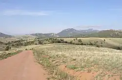 The Laramie Mountains are bisected by the Laramie River, which cuts a canyon through the mountains roughly due west of Wheatland, and then continues its generally eastward course to join the North Platte River near the town of Fort Laramie. The division marks the southern end of the continuous coniferous forest in the range, and separates the range into two parts. The southern part is generally drier and much more open, with little or no forest except for the southern end at Pole Mountain and surrounding area, where the interesting granite outcrops at Vedauwoo provide climbing practice and grand picnic scenery.